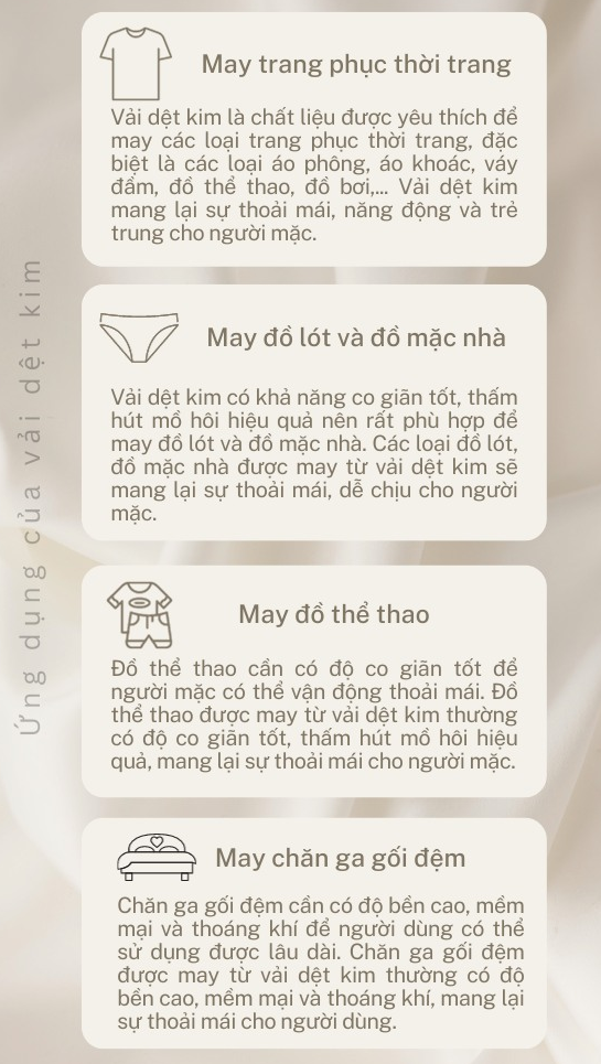 Vải dệt kim là loại vải được tạo ra từ các sợi được nối lại với nhau bằng kim và móc. Vải có nhiều ưu điểm như mềm mại, co giãn tốt, thoáng khí, dễ giặt, dễ bảo quản. Chính vì vậy, loại vải này được ứng dụng rất phổ biến trong ngành may mặc.